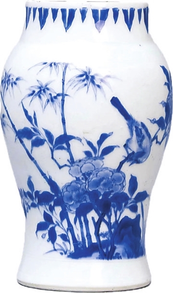 罐直口,阔颈,垂肩,长圆形鼓腹,圈足。整体造型似一颗莲子,是流行于明末清初的一种罐式。通体青花装饰,口沿绘一周大小相间的倒垂蕉叶纹,腹部绘竹石花鸟图案。