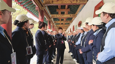 休息间隙,2组调度任燕正整理当天的工作笔记;“95后”讲解员李欣维对着镜子练习手势,让“莲花斗拱”的讲解随圣母殿飞檐的曲线自然起落。