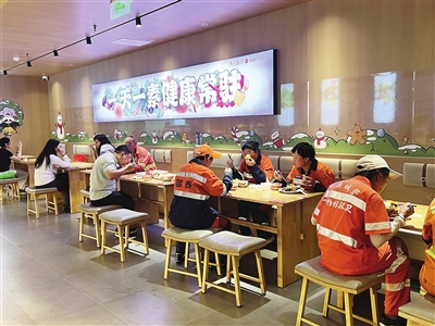 此后,餐厅推出服务,附近的环卫工,每天都能来,一日三餐免费吃。考虑到顾客较多,会安排环卫工与员工一起错峰用餐。“和我们吃的一样,管够。”餐厅经理笑着说:“有的环卫工第一次来时,会反复确认‘是不是真免费’。再来时,就像回了自己家一样,和我们慢慢熟悉了。”