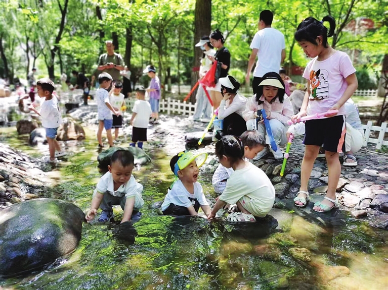 上午10时,市民潘晓艳带着孩子来到玉门河公园,东门附近的一条水溪处,不少孩子在此戏水。水很浅,两边绿树成荫,形成了一处清凉佳境。溪水从青石上漫过,形成独特景观。孩子们手持水枪、水桶等玩具,站在水中嬉戏,欢声笑语不断。