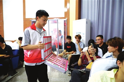 禁毒社工展示毒品仿真模型。