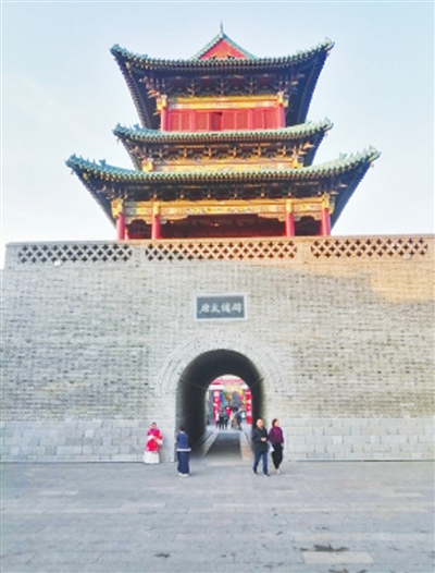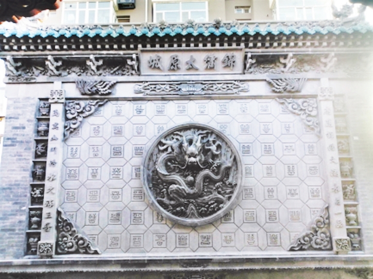 从西校尉营关帝庙到钟楼要经过一个小广场,小广场的门洞前是一个大大的青砖影壁,上部是“锦绣太原城”五个大字,两边的楹联为“禹奠山川汾水久琢三晋,唐迹锦绣文瀛永占一品”。影壁上布满各种字体的“晋”字。影壁前后两面正中心的图案分别为团龙和葡萄。这个小广场建有回廊,雅致而华美,这在寸土寸金的钟楼街显得非常珍贵。影壁楹联中“文瀛”二字,让人不免思绪万千。太原海子边有个文瀛湖,“瀛”是大海的意思,“文瀛”二字含有文运昌盛之意。这小广场可以算是我与钟楼相遇的序曲吧。序曲居然都如此文脉纵横,那么钟楼又将是怎样一种昂扬的情怀呢?