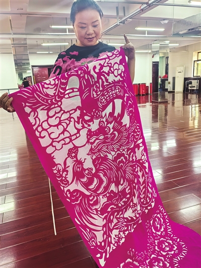 网上购买材料、揣摩图案寓意、研究剪刻细节……每一件演出服的制作,从设计图纸开始,团员们反复琢磨,既要体现剪纸艺术的精髓,又要符合旗袍的款式特点。制作时,在柔软且有韧劲的绒布上喷绘图案后进行剪刻,再加上绑带、里衬等,需要花费大量时间与精力。