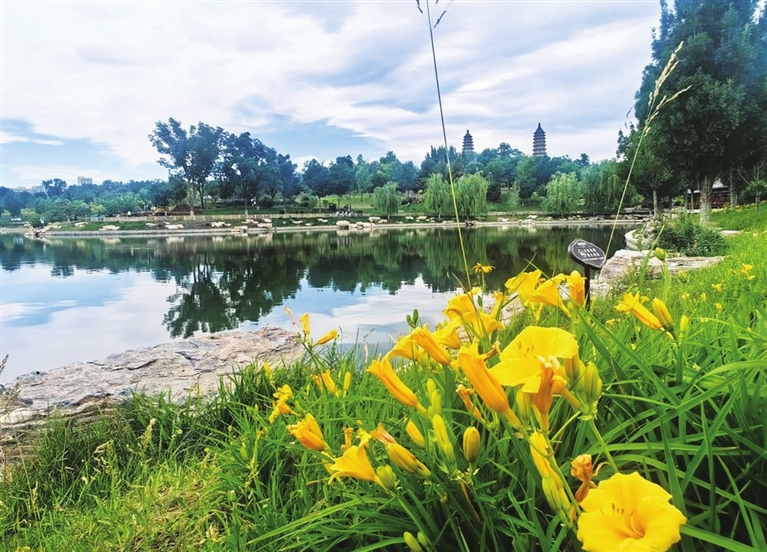 双塔公园里大花萱草已经盛开,游客沿着跑道漫步,随处可见萱草纤长的翠叶、粉红的花色,带给人们无尽的视觉享受;南海子公园的金娃娃萱草花也开得正好,暖黄色的花朵在微风中摇曳,散发着淡淡的清香,高高的花葶在风中摇摆,淡雅沉静、静谧柔美;还有和平公园、龙潭公园、古城公园内的多花萱草、折叶萱草、矮萱草等,金黄、橙黄、大红的花朵竞相绽放,连绵成片,美不胜收,与周遭亭台廊榭、小桥流水相辉映,有着“灿灿萱草花,罗生北堂下”的意境。