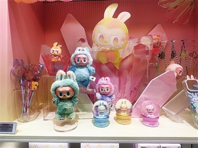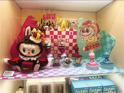 店里货架上的拉布布只有极少款式,并且明确“仅供系列展示”。工作人员介绍,目前购买正版只能通过官网、官方App、线上官方授权店等渠道入手。拉布布火了之后,娃衣、配饰、娃罩等相关周边皆供不应求。当前,潮玩正从小众爱好,演变为更多人的情绪表达窗口和陪在身边的玩具朋友。喜爱某一潮玩IP的人们会通过社交媒体交流购买和收藏心得,进行交换和转手买卖等活动,拥有和“晒出”潮玩是消费者的一种情绪表达。可以说,潮玩正成为一种“社交货币”,赋予了IP强大的社交属性。