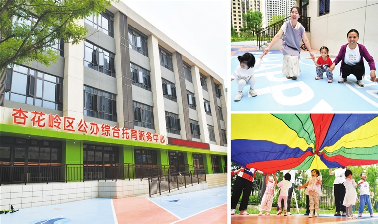 6月30日,刚刚投用的杏花岭区公办综合托育服务中心,老师正在带领孩子们开心地做游戏。该中心占地面积4000余平方米,设置托位150个,采用公建公营的管理模式,主要承担婴幼儿早期发展及儿童保健、托育从业人员培训评价等功能。左图为综合托育服务中心,右图为老师带着孩子们做游戏。 牛利敏 郝晨光 摄影报道