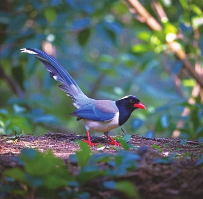 终于,在识图软件的帮助下,这种鸟的身份和特性有了眉目。该鸟名为红嘴蓝鹊,属于雀形目鸦科蓝鹊属,是国家二级保护动物。主要分布于尼泊尔、印度、缅甸、泰国以及中国等国家。在我们老家遇见的应该是红嘴蓝鹊的华北亚种。它的嘴和跗跖呈鲜艳的猩红色,前额、头顶、喉和上胸均为黑色,头顶至后颈的羽毛末端呈现白色、蓝白色或紫灰色斑点,其余部分为白色,有时带有蓝色或黄色的色调,两翅为黑褐色。尾羽长达35至47厘米,呈紫蓝色或蓝灰色,尾端呈白色。光从颜色上看,它就几乎占全了色谱里的内容,包括色彩鲜明的黑和白。它们主要生活在山区的阔叶林和针叶林中。由于老家的生态不断优化,所以从未见过的红嘴蓝鹊也落脚到此地。它们的食性很广,除了草籽、毛毛虫、鲜果之外,还敢吃蜈蚣、蜥蜴和其他鸟的鸟蛋和幼鸟等。它们之所以凶悍,是因为它们擅长于保护自己的同伴,勇于保护自己的雏鸟,领地意识特别强烈。
