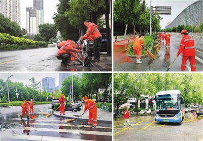7月3日,我市迎来大范围降雨,相关部门工作人员坚守一线,保障城市正常运行。左上图为市市政建管中心道排保障二所的工作人员在西太堡街值守;左下图为太原市环卫清洁和生活垃圾转运中心工作人员在长风商务区清理排水口;右上图为环卫工人清理道路积水;右下图为公交二公司二车队志愿者疏导交通。