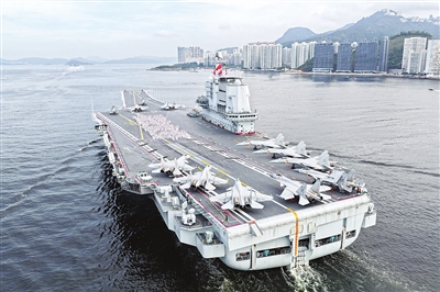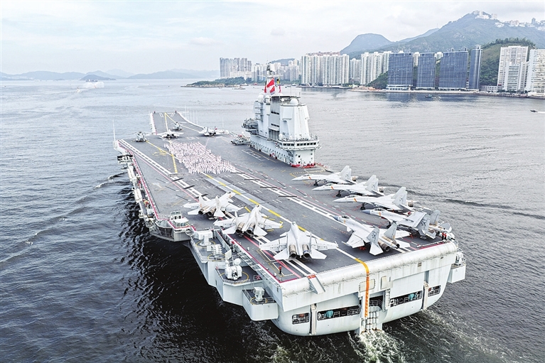 3日上午8时许,山东舰和3艘属舰组成纵队队形,在香港特区政府船队、驻香港部队舰艇、直升机伴航伴飞下,驶入维多利亚港。山东舰飞行甲板上,舰载战斗机、直升机列阵,700余名海军官兵身着白色军装,列队排出“国安家好”4个大字,表达爱国爱港的浓浓深情和对香港同胞的美好祝福。海上,香港特区消防船用“水门礼”欢迎编队;空中,香港特区伴飞直升机现场直播编队进港实况;岸边的民众隔海向来访官兵挥手致意。按照预定方案,山东舰和延安舰在维多利亚港西锚地锚泊,湛江舰和运城舰停靠昂船洲军营码头。