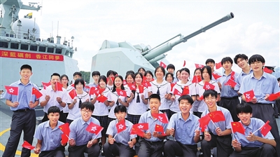 10时,湛江舰放下舷梯,海军和编队有关领导及官兵代表踏上昂船洲军营码头,与前来欢迎的香港各界人士亲切握手、互致问候。欢迎仪式开始,雄壮的国歌奏响。香港特区行政长官李家超致辞,代表香港特区政府和香港市民,对海军舰艇编队的到来表示热烈欢迎。中央港澳办、中央驻港机构、南部战区、驻香港部队相关负责人和代表出席仪式,并登上湛江舰、运城舰参观。