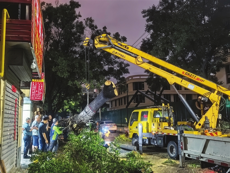 7月4日晚,受强对流天气影响,汾东南路社区农行宿舍附近一棵槐树在狂风暴雨中倒地,粗壮的树干横在永康南路上,枝杈压覆供电线路,引发片区断电。情况出现后,社区、供电等多部门迅速联动,连夜展开抢修,清理树木,恢复供电,确保居民正常生活不受影响。 周利芳 摄