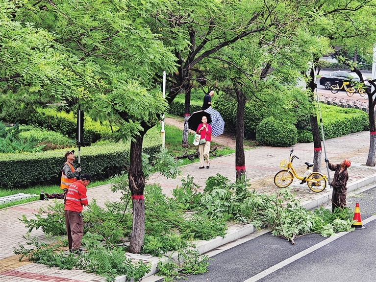 连续降雨导致行道树树枝存在掉落风险。7月8日,万柏林区城市综合服务中心工作人员在漪汾街辅路修剪树枝,消除安全隐患。 郭苑甫 摄