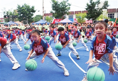 本次活动设有篮球操表演秀、技能挑战赛、3v3实战对抗赛三大板块。开场环节,孩子们身着统一服装,手持篮球登场。随着欢快的节奏,他们整齐划一地完成拍球、跳跃、转身等动作,灵动的身姿与清脆的拍球声交织,瞬间点燃现场气氛。