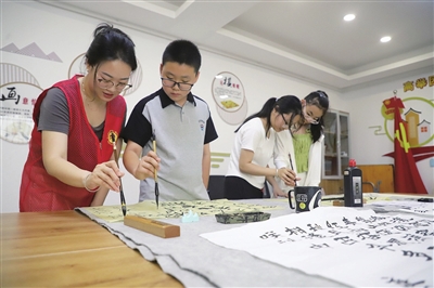 7月7日,千峰街道迎泽北社区暑期托管班开班,大学生志愿者与社区工作人员为孩子们提供作业辅导、书法、健身等志愿服务。 张昊宇 摄