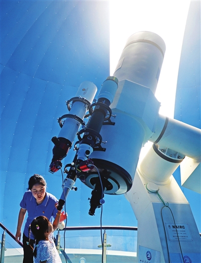 7月9日,家长带着孩子走进山西省科技馆天文观测台,观测天象,探索奥秘。暑假期间,山西省科技馆推出主题科普展、暑期科学课程、科普志愿者等系列活动。