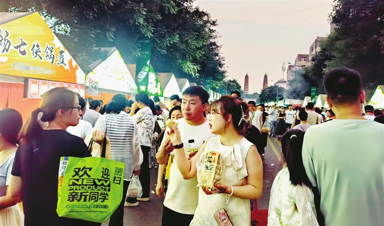 双塔公园北门附近的郝庄商贸集市上,臭豆腐、沾串串、烤鱿鱼、绿豆沙等上百种小吃齐集,空气中飘散着各种诱人香气,让人垂涎欲滴。“晚上凉快了,在这里吃喝玩乐一站式搞定,还能观看表演,太享受了。”市民郝宇欣一手拿着奶茶,一手晃动着荧光棒,沉浸在现场的电音节里。