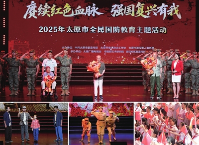 7月15日,纪念中国人民抗日战争暨世界反法西斯战争胜利80周年“赓续红色血脉 强国复兴有我”——2025年太原市全民国防教育主题活动在晋剧艺术中心大剧场举行。 上图为致敬老兵;左下图为情景表演《英烈归队》;中下图为情景朗诵《烽火岁月》;右下图为台下观众合唱《歌唱祖国》。