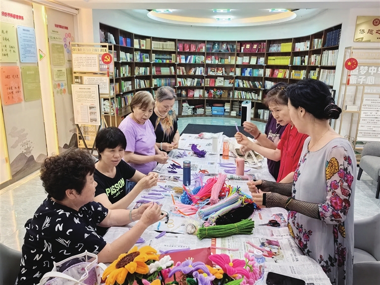 走进党群服务中心,空调温度显示26℃,比室外凉爽得多。桌子上,摆放着藿香正气口服液、风油精、花露水等用品。恒大滨河左岸小区的居民孙凤萍每天都来,利用社区提供的材料,一边制作扭扭棒花束,一边与邻居们聊天。为了不吵到上班的社区工作人员,大家自觉地压低了声音。