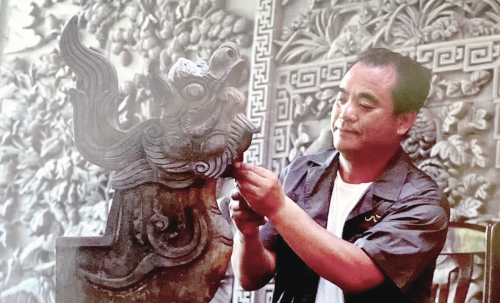 雕刻时,匠人先将砖蘸水磨平,再以钢针勾画打稿,最后执刀凿刻,把花草、人物、瑞兽从青砖里“请”出来。“一块摆件,老师傅得刻近一个月。”韩永胜指着桌上的成品说。
