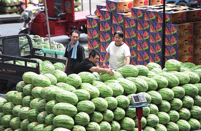 随着本地西瓜大量上市,西瓜价格持续回落。图为7月20日,省城河西农副产品市场内,商户正忙着卸货。 邓寅明 摄
