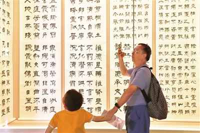 展览尤为引人注目的是多幅气势恢宏的巨制,如隶书柳宗元《晋问》节选、隶书《晋祠铭并序》等,尺幅多在3米以上。斜坡展台的设计,为巨幅作品展示创造了适宜空间,也为观众提供了良好观赏角度。