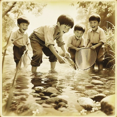 有时,我们会呼朋引伴,选一个不大不小的池塘,用石块、泥土堵住它与小河连通的进出口。接着,水桶、脸盆轮番上阵,将塘中的水舀到小河里。待塘水渐干,鱼虾无所遁形,我们便兴奋地将它们一网打尽。此时,浑身沾满泥浆的孩子们,又会跑到大一点的水塘,脱光衣服跳入水中,欢快地“狗刨”几个来回。洗去一身泥垢、燥热与疲惫,哼着歌儿满载而归。