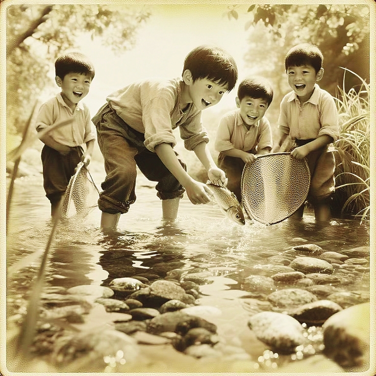 还有一次,上午割完羊草,我独自一人到河边钓蜻蜓。正寻觅目标时,河中“噼啪”一声,一条三四寸长的鱼在水面打挺后,径直朝我游来,钻进了附近的水草丛。我被它吸引,悄悄放下钓竿,蹑手蹑脚靠近水边,想拨开草丛一探究竟。不料脚下一滑,整个人“扑通”栽进河里。我吓得不轻,衣裤也全湿透了。无奈之下,我只好趴在村南井台的矮墙上,等太阳把衣裤晒干,才磨磨蹭蹭地回了家。那次被鱼儿“捉弄”的经历,成了童年独特的印记,至今仍历历在目。