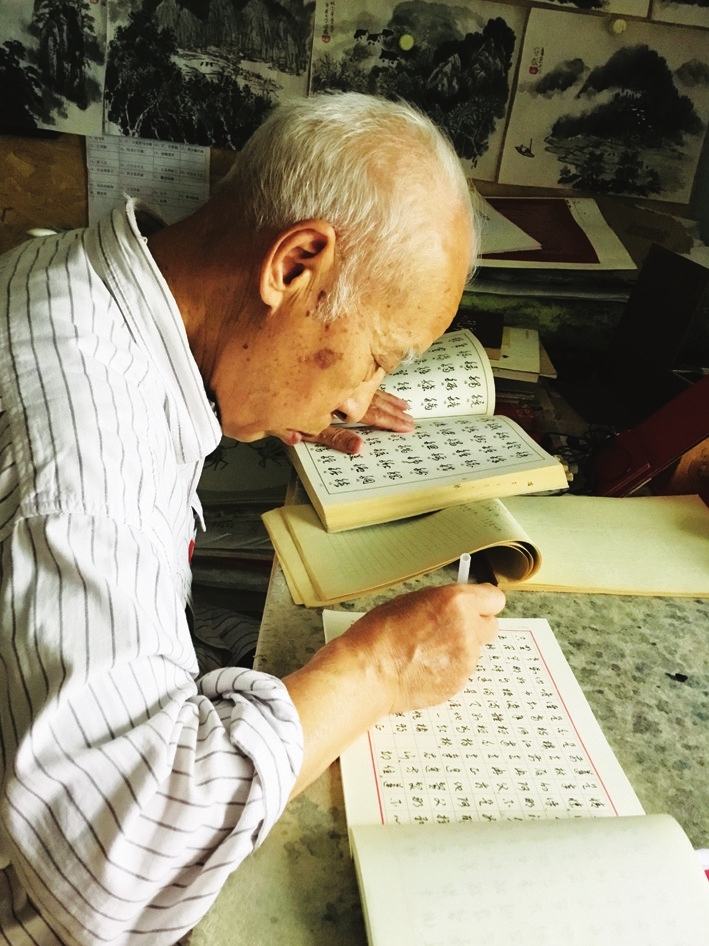 创作时,老伴先查阅字典和学习资料,逐字逐句地再次推敲诗作中的字词是否精准,哪些地方还能进一步优化。诗作定稿后,又进入漫长的书写试练。画桌上的练习纸越堆越高,一张不满意就重写,格式欠佳就推倒重来。中性笔写不出笔意,他立刻换上美术钢笔,在墨色流淌中寻找最佳笔触。我在一旁练琴时,也常抽空为他添茶续纸,看他沉浸在笔墨世界里。