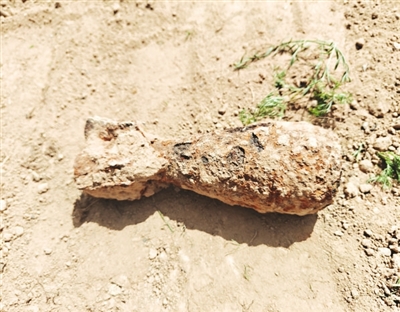 7月16日9时许,市民许先生沿着五龙口街到东山,准备挖点土使用,可挖了没几下,铁锹就碰到一个铁疙瘩。铁疙瘩的外形酷似炮弹,许先生担心发生意外,赶紧报警求助。