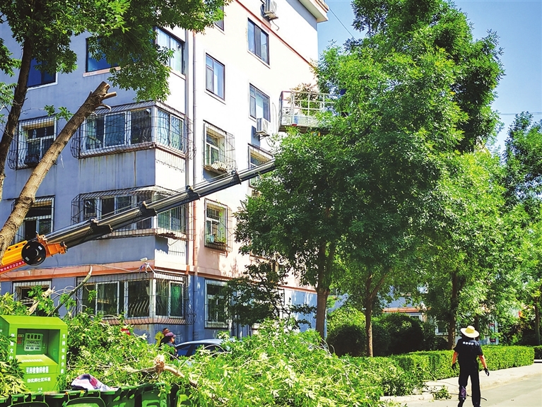网格员与物业负责人沟通后,调来了高空作业车,由专业人员对紧贴居民楼的树枝进行修剪。经过3个多小时的作业,大树完成“理发”,看上去更清爽,居民也反馈家里亮堂了。