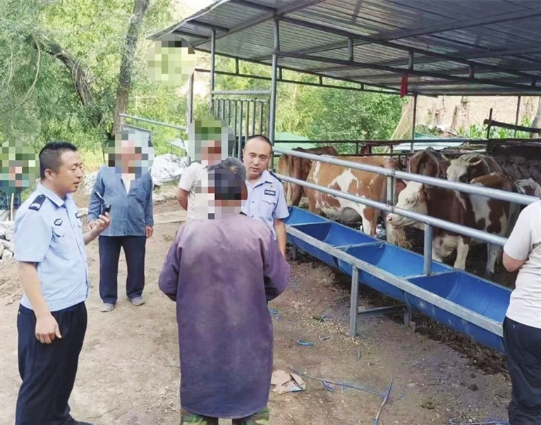 天池店派出所民警耐心安抚村民的激动情绪,细致询问事发时间、牛群数量及庄稼受损的具体情况。因一时无法找到牛主人,为防止牛群再次惹祸,民警与多名村民一起,先将它们赶回村子并关起来。随后,民警联系村干部一同勘查农田,仔细清点被啃食的庄稼面积,记录受损程度。与此同时,另一组民警围绕周边村庄排查牛群来源。