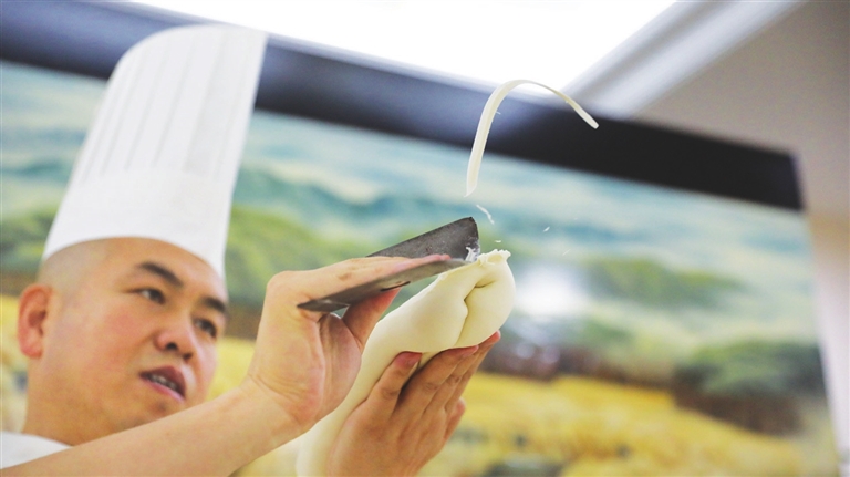 刘鹏凭借这手出神入化的刀削面技艺,将“柳叶乘风,银鱼落水”的豪放演绎得淋漓尽致。2010年上海世博会期间,他曾带领全晋会馆的面点师傅,向世界展示了这令人叹为观止的飞刀技艺。其间,他用精湛的刀工、根根分明的三棱面,以及秘制卤汁,彻底征服了中外游客,刀削面日销上千碗,成为名副其实的“爆款”,让世界领略了山西面食的非凡魅力。来自山东的一名游客表示,刀削面制作技艺神乎其神,咬头筋道,让人念念不忘。