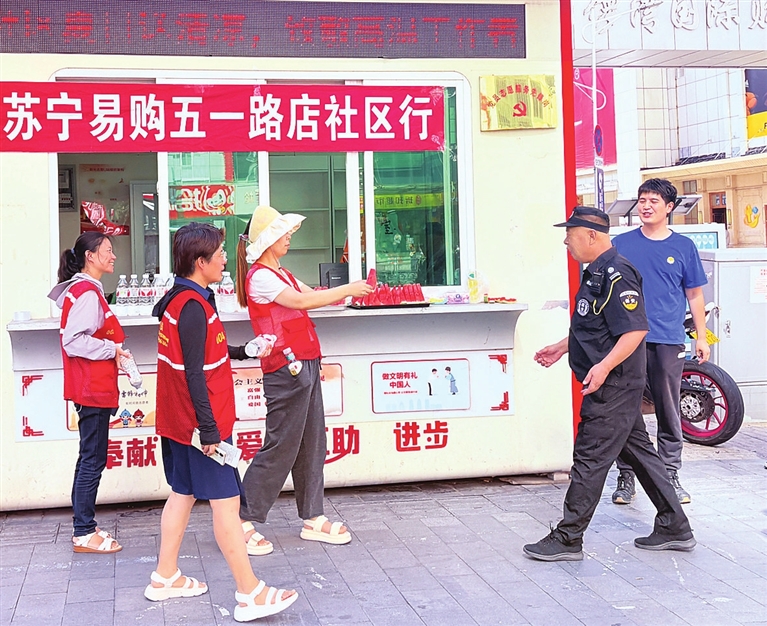 7月21日,迎泽区柳巷街道海东社区联合辖区爱心企业,在社区志愿服务站开展“夏日送清凉,关怀暖人心”公益活动,为外卖骑手、快递员、环卫工人等高温作业人群送上防暑降温物资。郭晓华 摄