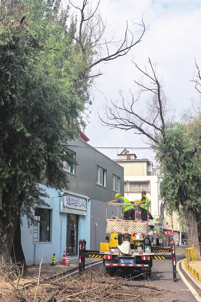 为保障辖区安全、美化居住环境,7月23日,在文华苑社区网格员积极协调配合下,园林部门对八一街平阳路至寇庄西路段14棵柳树实施集中统一修剪。 周利芳 摄
