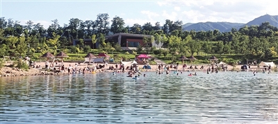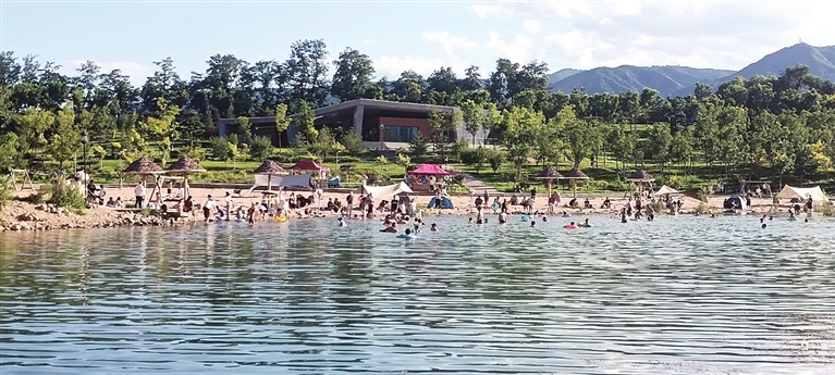 7月30日晚7时许,被称为“太原小三亚”的汾河景区四期游人如织,蜿蜒的汾河水打造出宛如海边的氛围感,孩子们有的穿着泳衣、带着漂浮带,在河里徜徉;有的穿着短裤、凉鞋,在河边尽情玩耍,笑声此起彼伏。不论是挖沙、泼水、捞小鱼,还是露营、野餐、捉迷藏,仿佛置身三亚海滩的惬意。“水量不算太大,浅的地方刚到小腿肚子,可以放心让孩子们玩。大人即便不下水,在岸边也挺凉快!”
