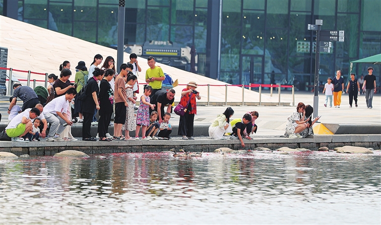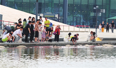 7月30日,太原植物园里,孩子们在水边喂鱼,享受欢乐的假期时光。王韵菲 摄