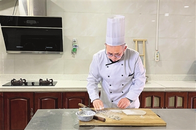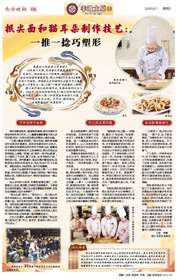 多年来,在这些饭店的后厨,韩林保精心制作面食,并向徒弟们传授着技艺。他以拇指为笔,在案台上“绘制”一场场指尖芭蕾——揪下一小块荞麦面团,拇指轻捻向前一推,面块便卷曲成贝壳状的猫耳朵,整齐排列如艺术品。“力道要柔中带刚”,他边讲边演示,手腕翻飞间已有20余个猫耳朵跃然案上,行云流水般的操作赢得大家赞扬。