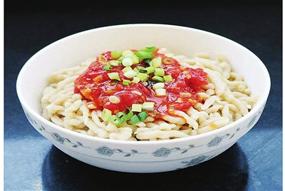 “三揉三醒是老规矩。”操作台前,韩林保将醒好的豆面团反复揉压,面团在他掌间如行云流水。加水调制的面糊被舀进井字形木制抿尖床,随着他右手持抿拐在铁制拍子上规律滑动,细长的面丝如雨帘般坠入沸锅。“老辈人说‘抿拐一响,神仙跳墙’,这力道轻了不成形,重了会断,全凭手腕的巧劲。” 韩林保介绍。蒸汽氤氲中,面丝在锅中翻涌成浪,逐渐显现出独特的扭曲形态,恰似书法中的飞白线条。煮熟后捞出,浇卤即食,香气四溢飘散。