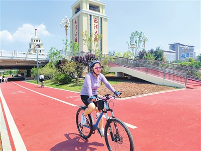 盛夏的汾河景区,滨河自行车专用道上,骑行者一路听鸟语、闻蛙鸣,好不惬意。张清芳熟练地从桃园四巷的公共自行车点取出一辆单车,轻盈地跨上车座,驶入宽阔的滨河自行车专用道。这条宽5米的彩色陶瓷颗粒路面,在阳光下泛着温暖的光泽,像一条绚丽的丝带沿河蜿蜒。沿途赏美景,分外惬意。