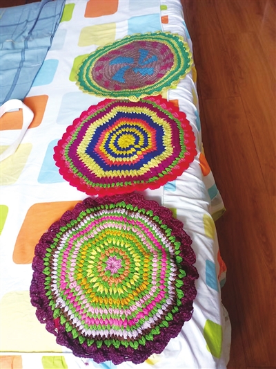 记得有次和老伴去迎泽桥头散步,休息时我拿出自己钩的坐垫,一个圆的一个方的,都是加厚的,又方便又舒服。周围的老人见了都围过来夸,后来我又钩了好些送给同院的老人。受我的影响,大家也总送我些手工物件:老同事张润莲编的坐便套精巧得很,小姑子钩的条纹坐便套也养眼,这份情谊暖到心里。
