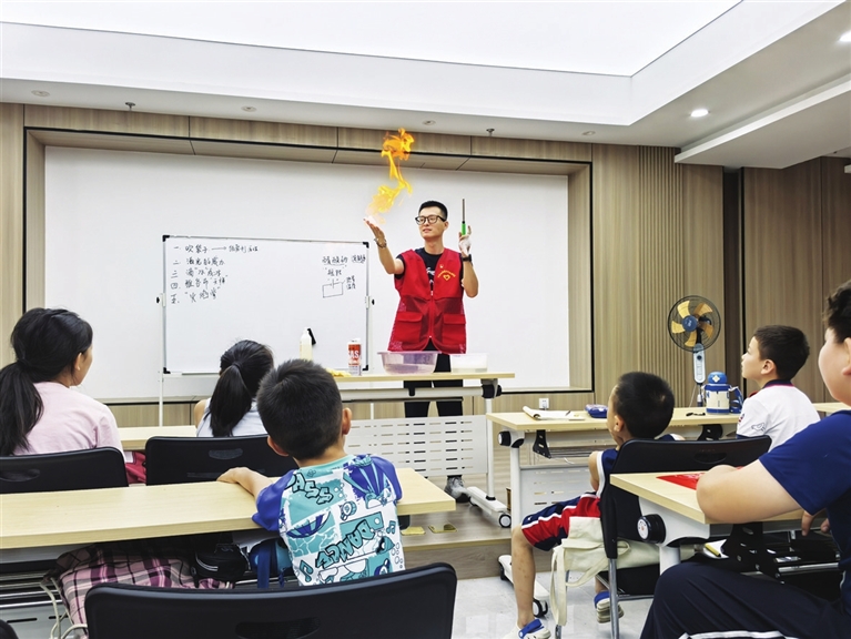 为解决双职工家庭假期带娃的难题,社区办起暑托班,不仅吸引来许多中小学生,还有一些居民主动来当志愿者。居民戴先生是一所初中的物理老师,精心策划了一场奇妙的“物理魔法秀”。