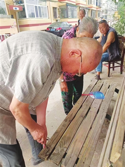 记者了解到,这些长椅、长凳是小区居民日常歇脚、闲聊的重要设施。然而经年累月的风吹日晒和频繁使用,经常出现木板松动翘起、钉子脱落的情况,不仅影响使用,更暗藏安全隐患。这一情况被热心的王大爷看在眼里,8月4日,老人自带锤子、螺丝刀和备用钉子来到现场,俯下身,仔细检查每一处松动木板和缺失钉子的位置。熟练地将松脱的木板对齐压紧,用带来的新钉子仔细加固,再用锤子严实敲打。伴随着清脆的敲击声,原本“病恹恹”的长椅长凳很快焕然一新,恢复了往日的安稳,此时王大爷已经大汗淋漓。