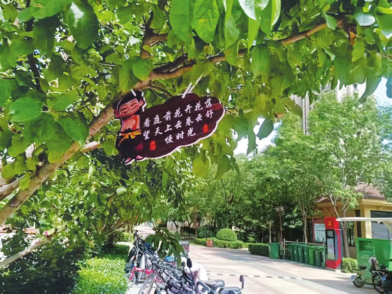 “春深不知处,花开半阙香。”“寻芳不觉醉流霞,倚树沉眠日已斜。”“风露渐凉人散后,倚阑闲看一池星。”……每块牌子上,都镌刻着精心挑选的诗句或富有意境的美文。居民在树下赏景时,顺便读一读这些文字,总会有所感悟。