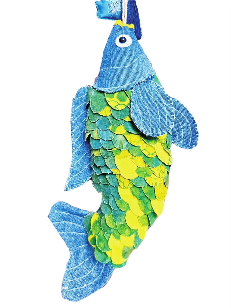 这条锦鲤的灵感源自社交平台博主的分享,蓝黄绿拼接的模样像极了池塘里摆尾的锦鲤。当下便动了心思,翻出女儿穿小的那条靛蓝牛仔裤,裤腿磨出的毛边处自带“做旧感”。缝合鱼身时,两片牛仔布正面相对,针线穿过布料的瞬间,仿佛听见旧日声响:裤脚的破洞是女儿在操场跑跳时蹭的,未剪净的线头勾住手指,让人想起买这条裤子时孩子踮脚转圈的模样。