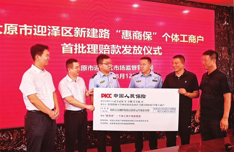 8月12日,太原市“惠商保”项目新建路个体工商户首批理赔款发放仪式在迎泽区市场监管局举行。人保财险理赔人员为新建路改造工程受损的64家个体工商户发放69天预赔付理赔金71万余元。