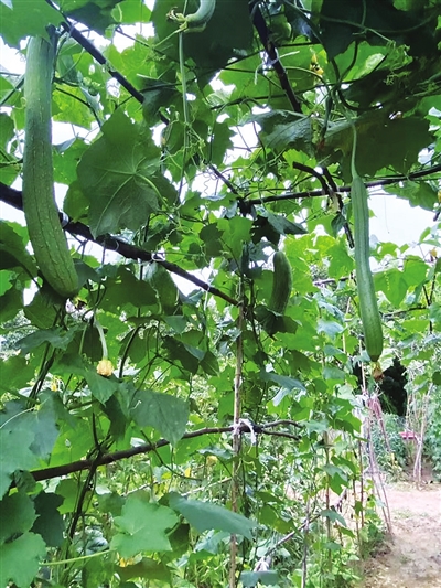 我们直奔木耳菜而去。种在地里的那垄木耳菜,有大自然阳光雨露的滋养,藤蔓攀在木架上,叶片生机勃勃,有的比脸还大。小杨又热情地给我们摘了茄子、丝瓜、黄瓜、辣椒、香菜、长豇豆、扁豆角……我还讨要了两株薄荷苗,打算带回家栽种。