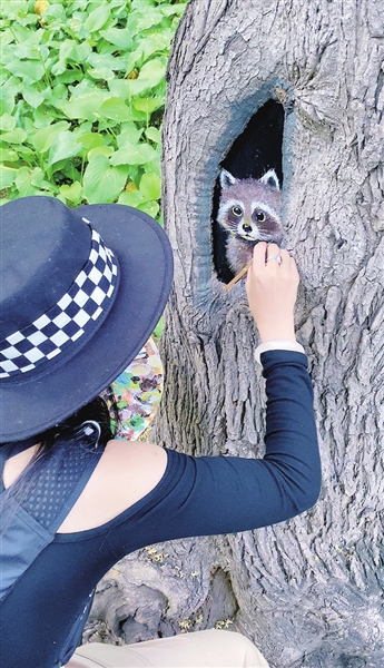 “从这个树洞的形状来看,太适合画一只松鼠了。”她在一处树洞前观察了10多分钟,随后快速勾勒着松鼠的形状,再上色,两个小时后,一只活灵活现的松鼠画好了,和环境很契合。路过的行人见了,忍不住拿出手机拍照,“真像,挺好看。”