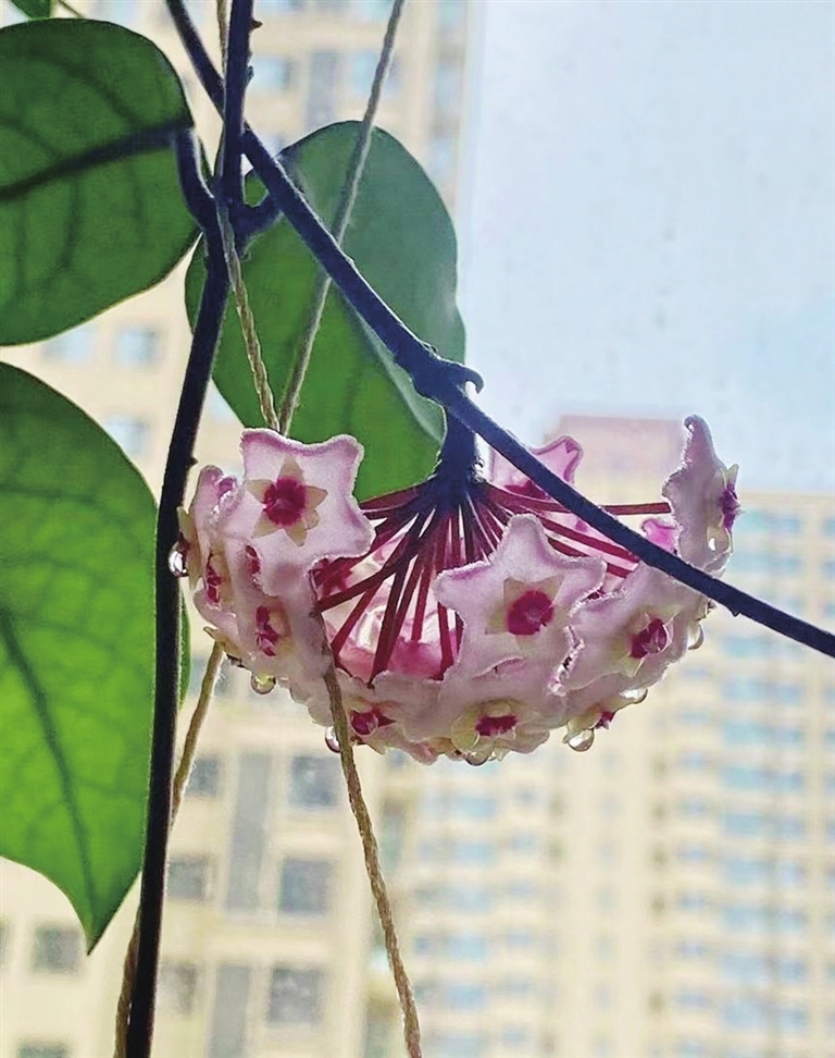 每日清晨,总忍不住留意花色鲜艳、形状奇特的球兰花的生长。从饱满的花苞慢慢舒展成五角星簇拥的花团,暗调的花瓣晕染出绚丽的粉色,每一点微小的变化都藏着欣喜。我悄悄盼着,或许还有更多惊喜。