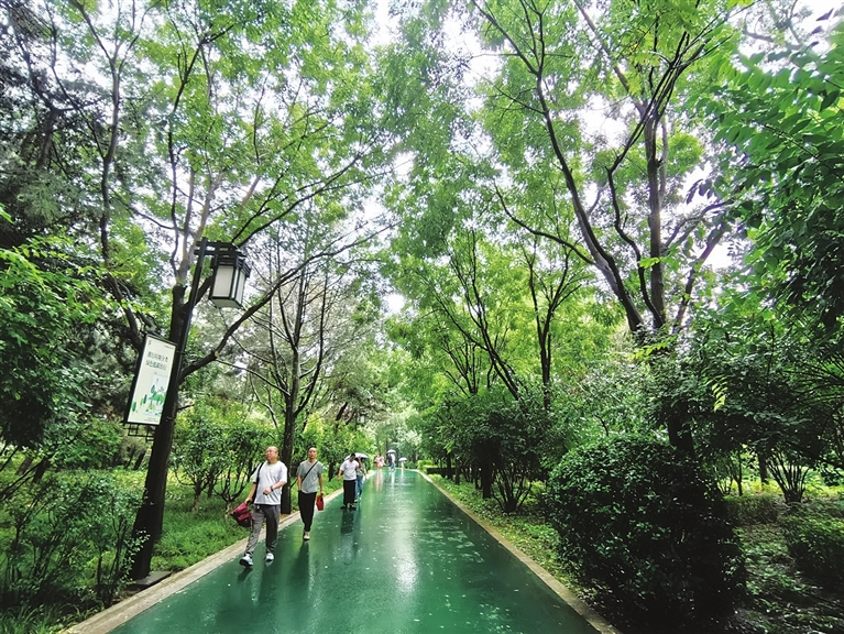 市民刘佳花退休后,养成了来迎泽公园晨练的习惯。当天清晨雨势较大,耽搁了。上午10时许,她入园散步。由于天气缘故,公园比平时清净许多,空气中弥漫着泥土的芬芳和花草的清香,让人忍不住深呼吸。半个多小时后,又下起了蒙蒙细雨,她聆听着雨打树叶的旋律,看着清幽的亭台楼阁,不由心生“斜风细雨不须归”的闲情逸致。