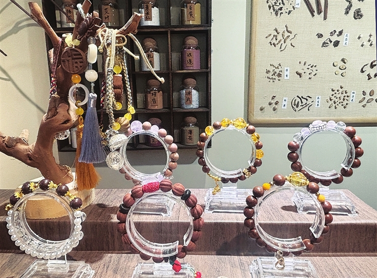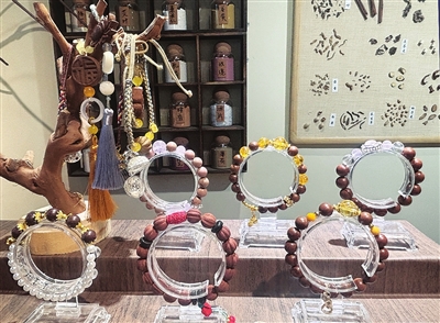 手工坊的店员表示,不一样的中药材搭配,功效有区别,可根据个人情况选择。王锦霞最近睡眠不好,挑选了安神助眠的“药方”。在现场,店员对这些中药材进行了研磨,再混合香粉与粘粉,经过揉捏、塑形、打磨等多道工序,最终凝结成珠。又经过几天的晾晒,王锦霞再次来到店里时,终于拿到了这款手串,感觉挺满意,“闻着挺香,也很漂亮。”